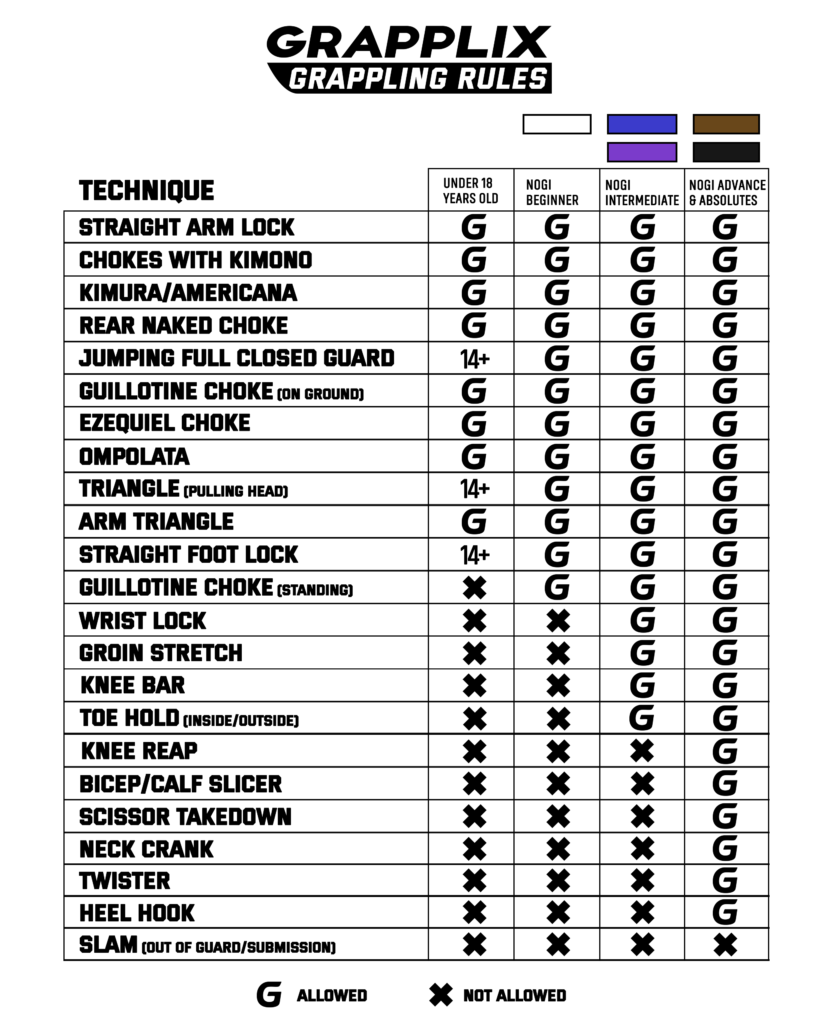 Guillotines (all allowed on the ground) blue belts and above for standing